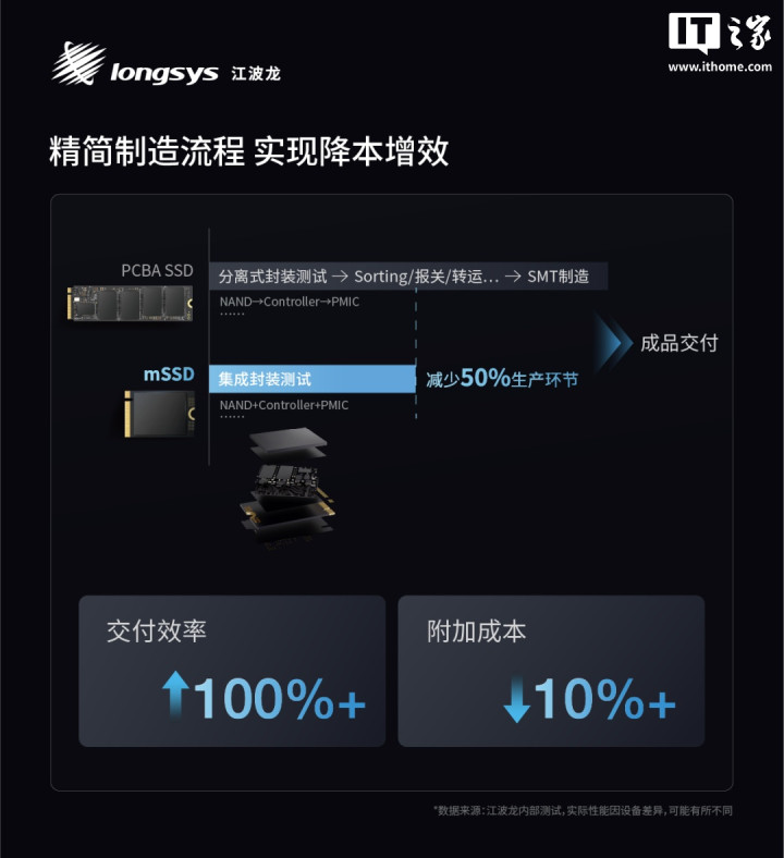 mSSD简化了PCBA分离式SSD的复杂生产流程。与传统方式需先将Wafer在不同工厂完成NAND、控制器、PMIC等元件的封装测试,再转运至SMT工厂进行排产贴片不同赚配网,mSSD完全省去了PCB贴片、回流焊等多道SMT环节及各站点转运,实现了从Wafer到产品化的一次性封装完成,将交付效率提升了1倍以上,进而使整体AdditionalCost(附加成本)下降超过10%。