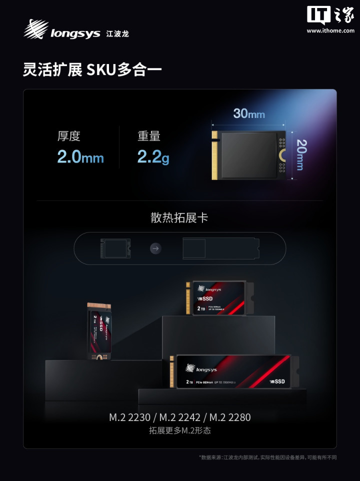 IT之家从江波龙官方获悉,mSSD产品搭载TLC/QLCNANDFlash,提供512GB~4TB多档容量选择,并配备卡扣式散热拓展卡,无需工具即可灵活拓展为M.22280、M.22242、M.22230等主流规格,实现SKU多合一,灵活适配不同类型的应用需求。