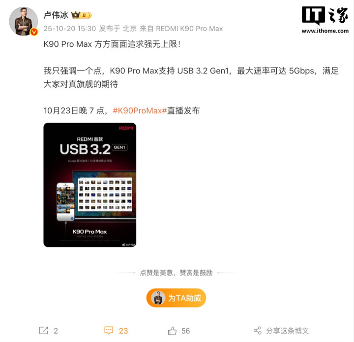 IT之家10月20日消息江苏配资网,今天下午,小米集团合伙人、总裁,手机部总裁,小米品牌总经理@卢伟冰发文宣布:“K90ProMax方方面面追求强无上限!我只强调一个点,K90ProMax支持USB3.2Gen1,最大速率可达5Gbps,满足大家对真旗舰的期待。”