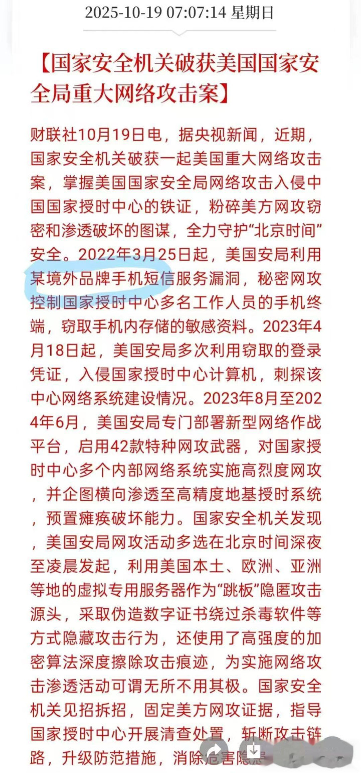 好在国家安全机关成功阻止了此次攻击,据财联社报道,在这一轮对中国授时中心的网络攻击中,美国安全局利用某境外品牌手机短信服务漏洞汇利资本,控制国家授时中心有关工作人员手机终端,窃取手机内存中的敏感资料,为己所用!
